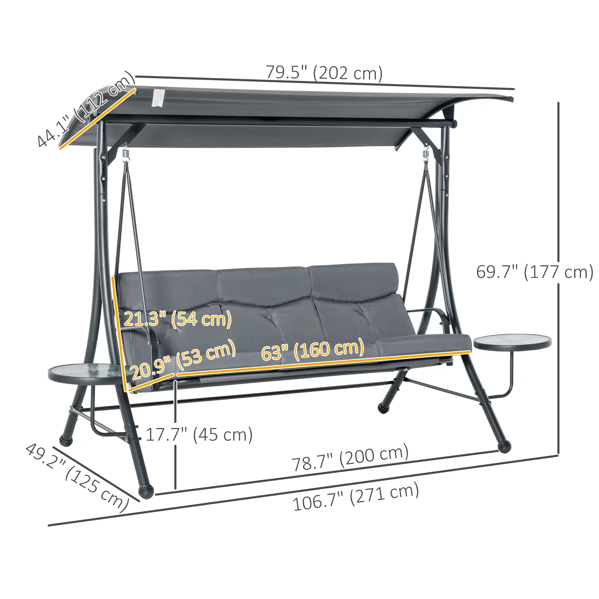 3 Seat Outdoor Swing Chair, Steel Bench With Canopy, Coffee Tables, Cushion, Dark Grey