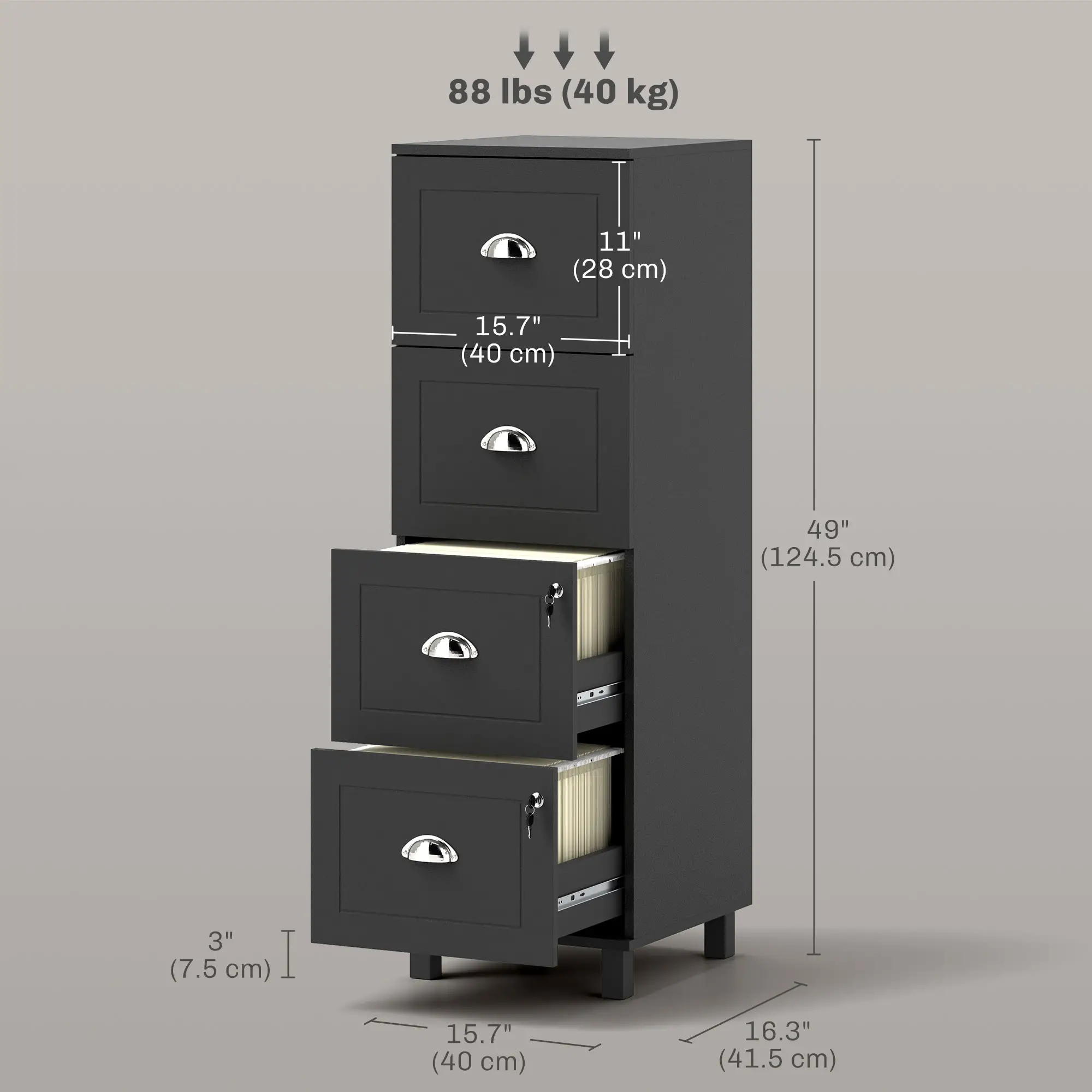 - 4 spacious drawers with adjustable bars for A4 and letter-sized files