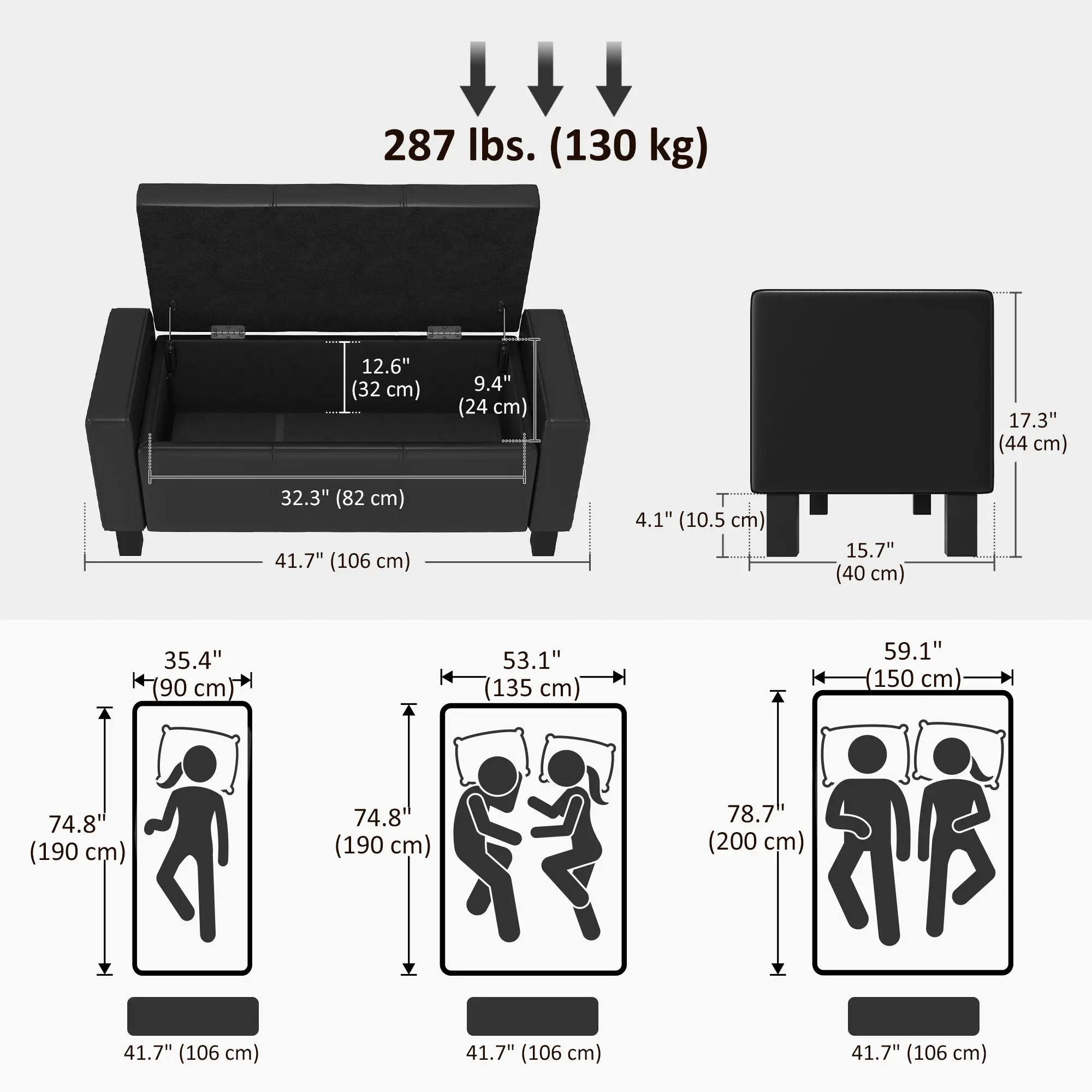 - Storage Dimension: 31"L x 12.5"W x 7.75"H (78.74cm x 31.75cm x 19.69cm).