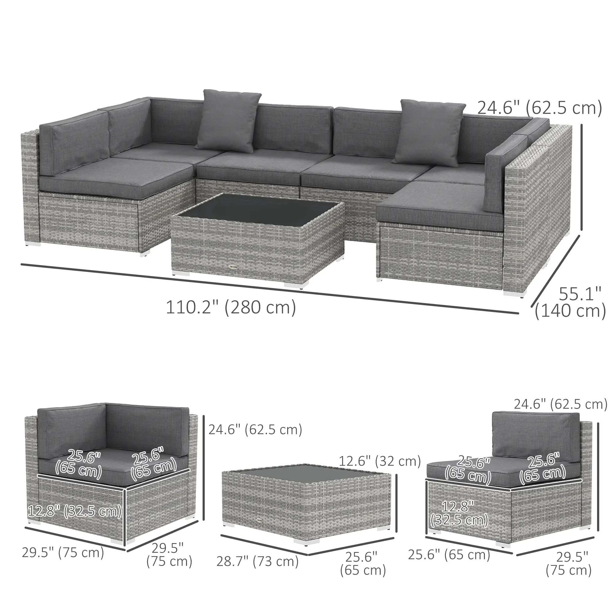 - Middle sofa: 29.5" L x 25.6" W x 24.6" H (75 x 65 x 62.5 cm)