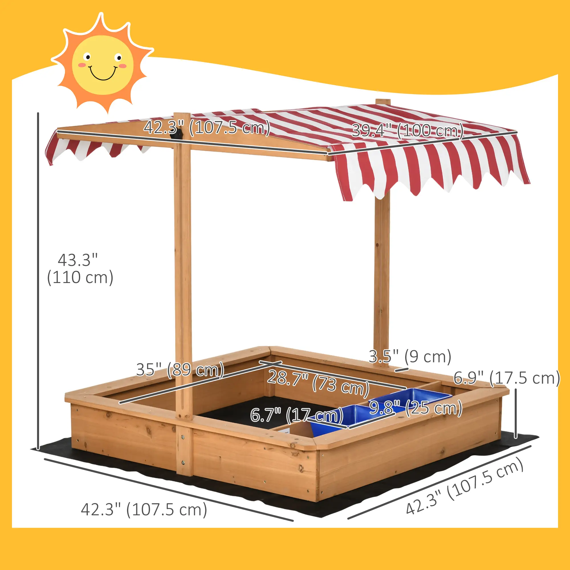 Kids Wooden Sandbox, Adjustable Height Cover, Bottom Liner, Seat, Plastic Basins, for 3-7 Years