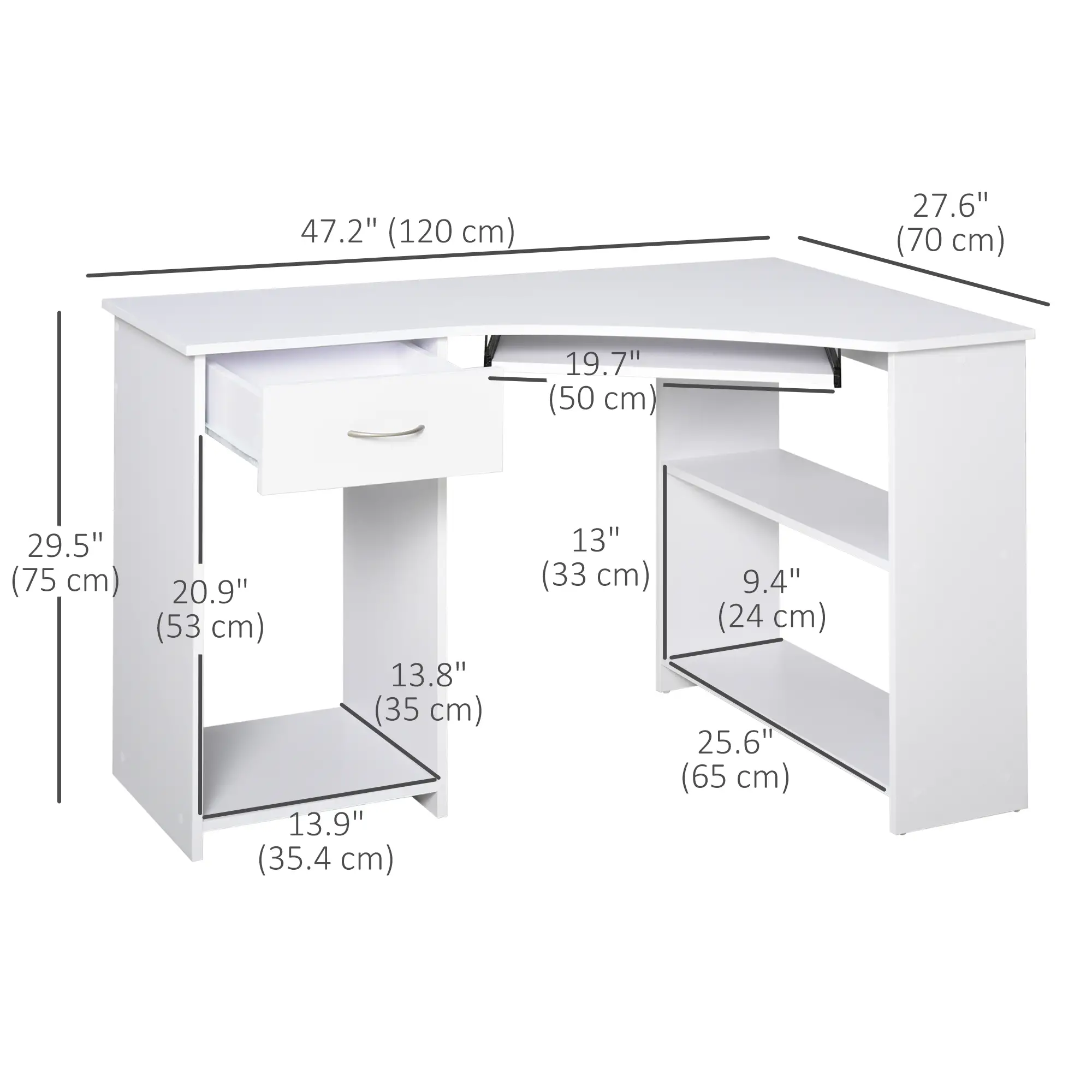 L-Shaped Desk With Keyboard Tray, Shelves, Drawer, CPU Stand, White