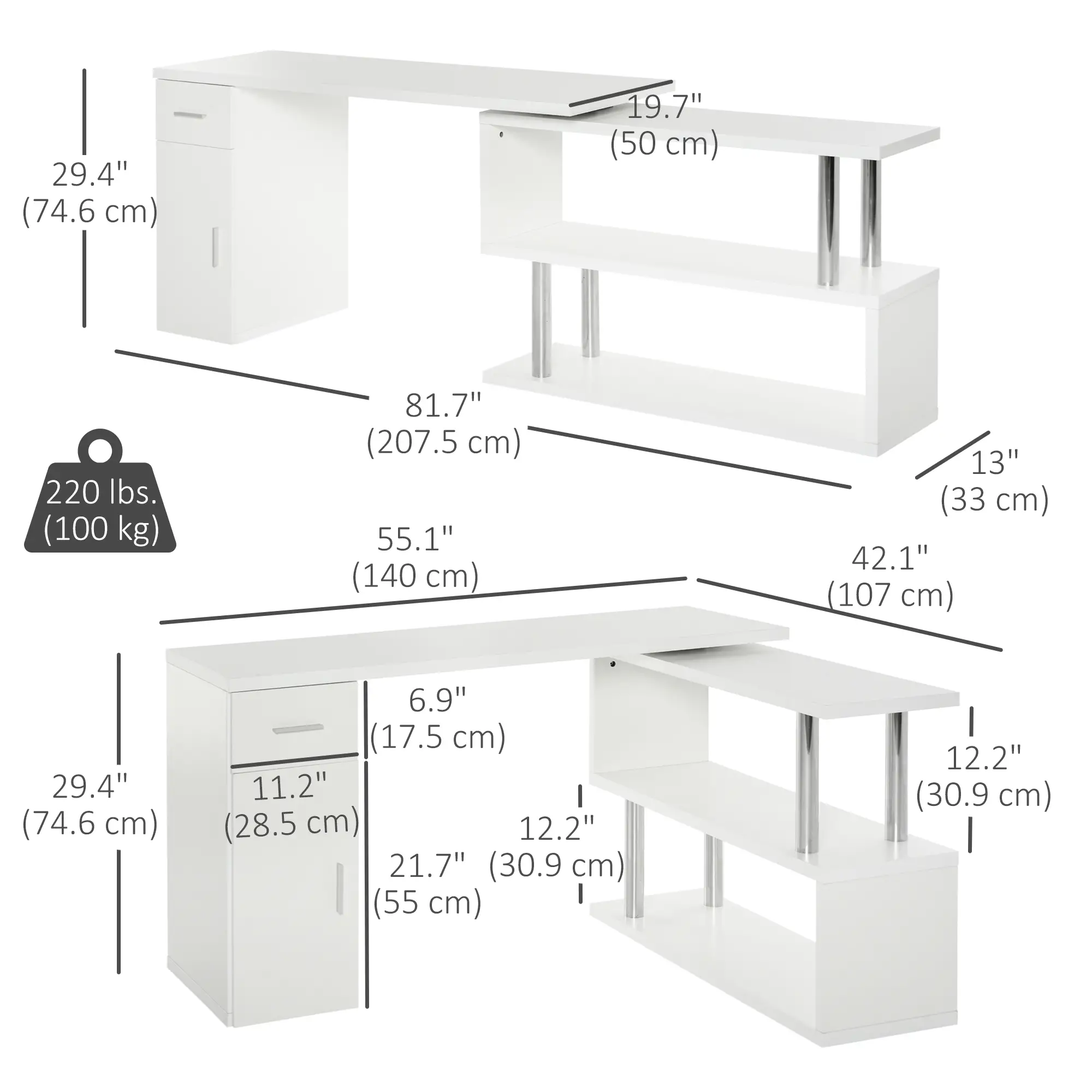 L-Shaped Rotating Computer Desk, Storage Shelves, Cabinet, Drawer, White