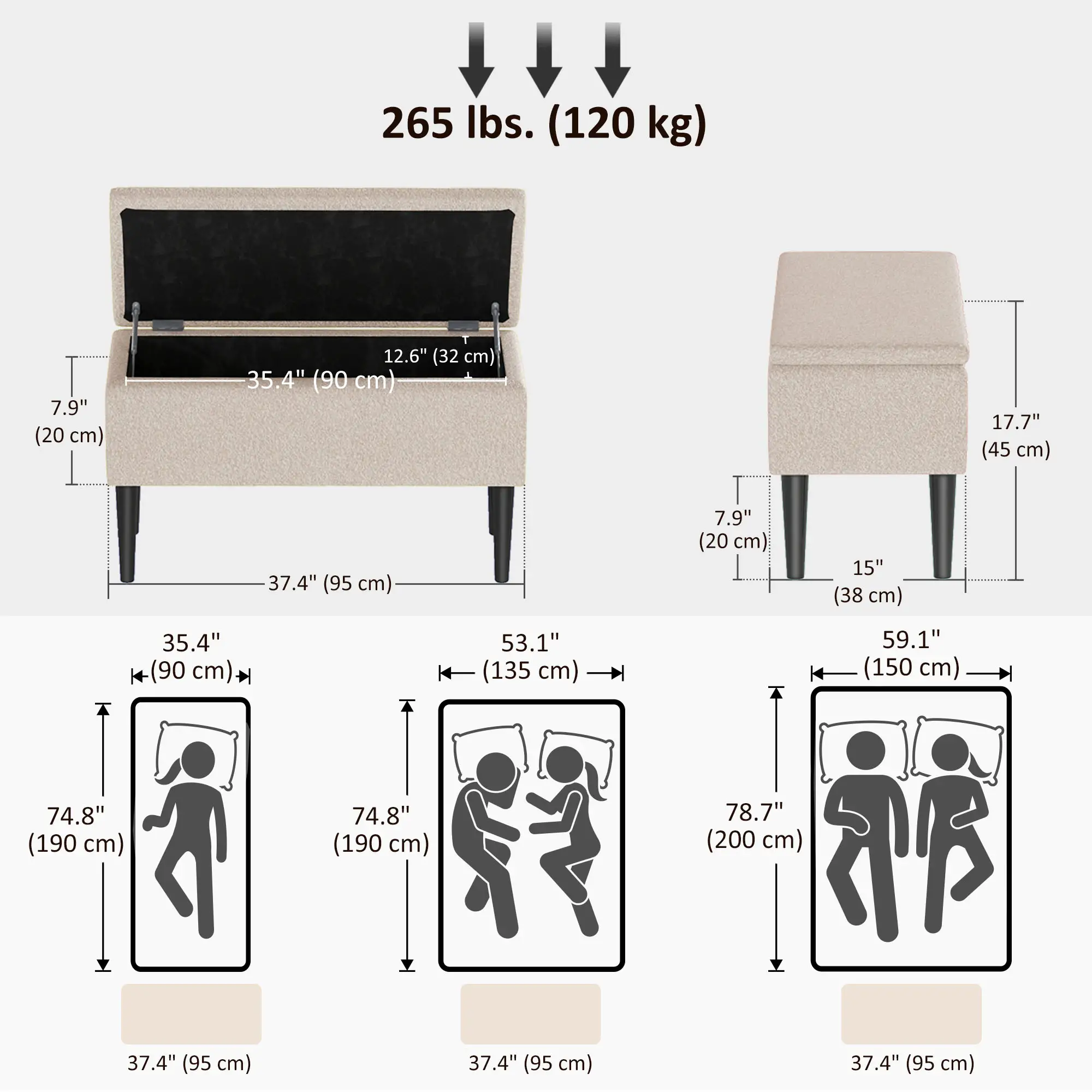 - Overall dimensions: 37.4" L x 15" W x 17.7" H (95 x 38 x 45 cm)
